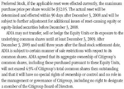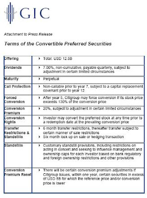 From the comparison table above, both ADIA and GIC would have the option to convert the Citigroup ( Citibank) share to a common stock at the price of around $31.83 - $37.24 ( around 2010 - 2011) and $31.2 respectively, given the assumptions and assuming no adjustments.